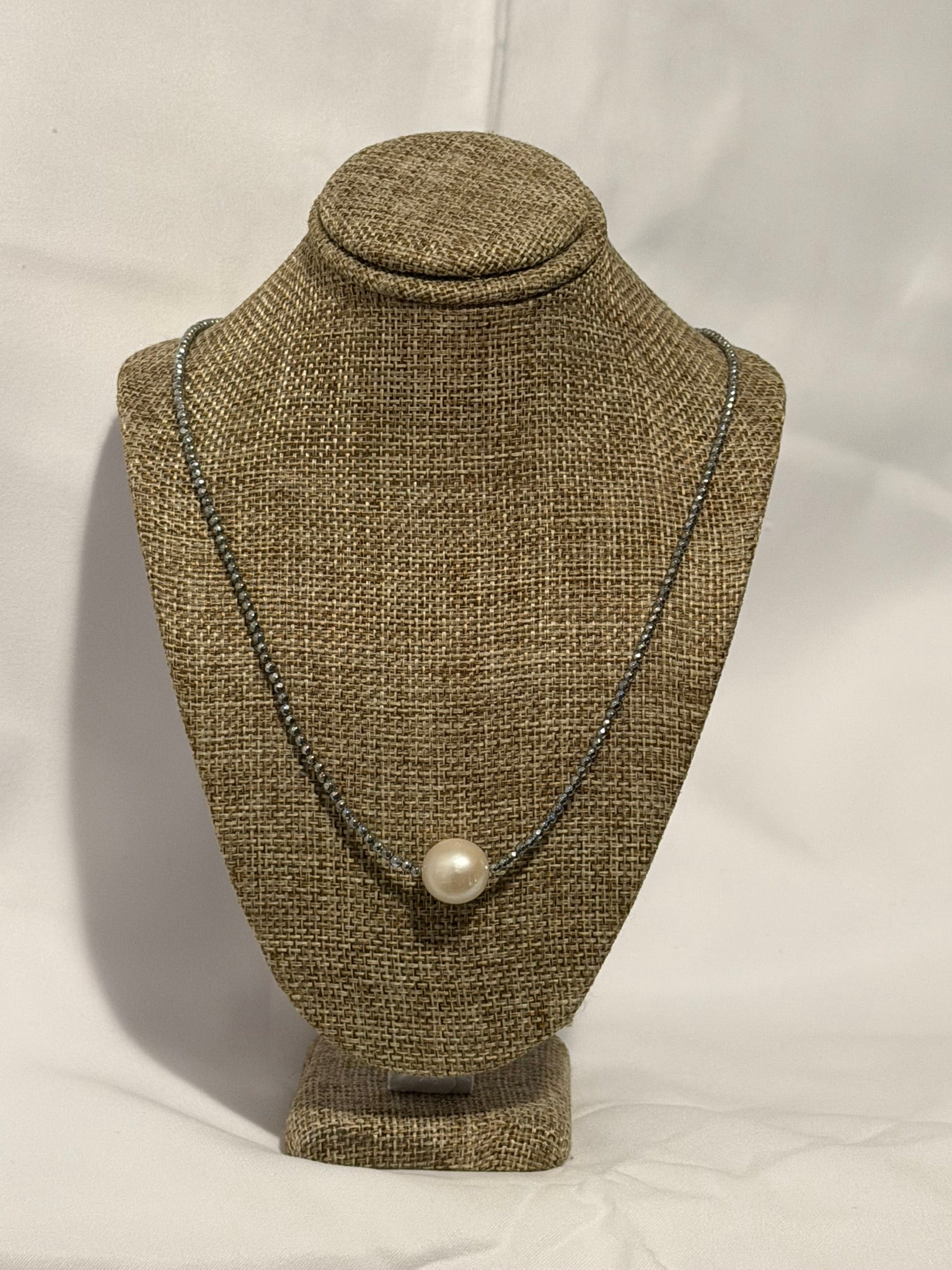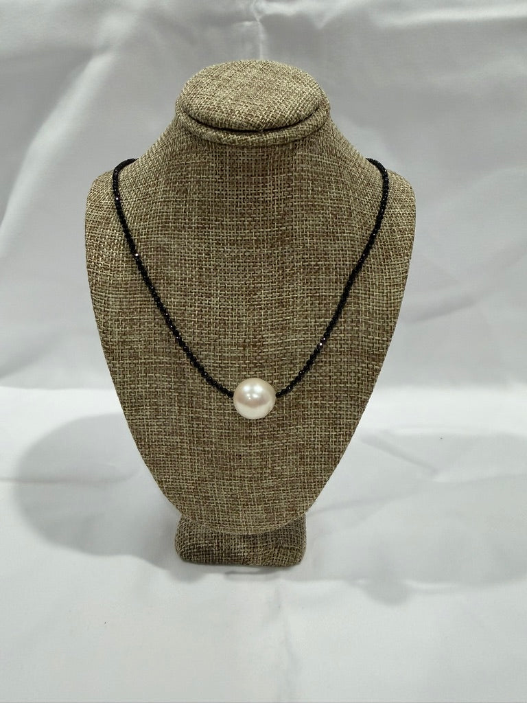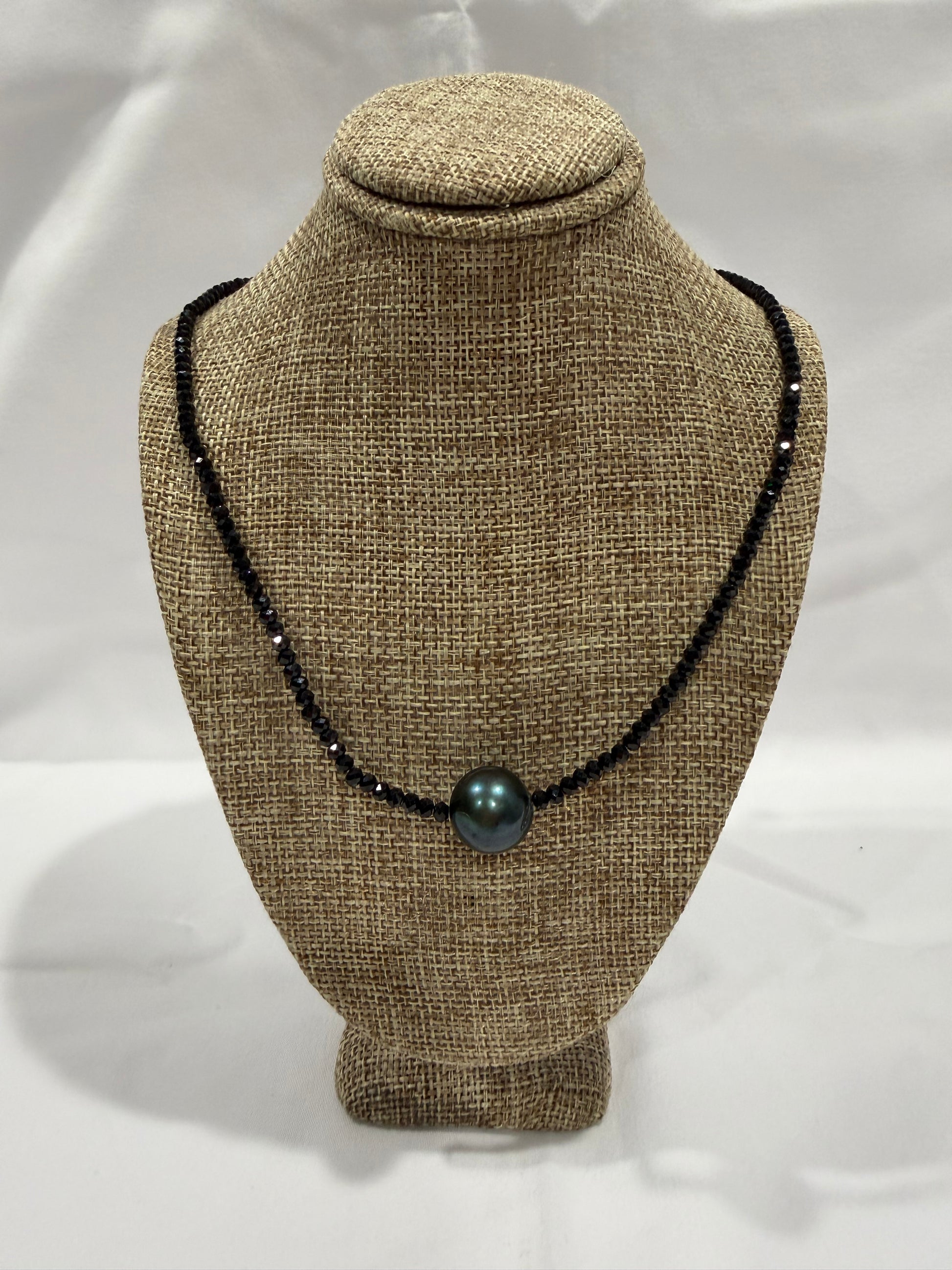 A refined and eye-catching necklace featuring a strand of faceted black beads that shimmer subtly with every movement, centered by a luminous dark pearl accent. The contrast between the sparkling beads and the smooth, glossy pearl creates a balanced look of mystery and elegance.