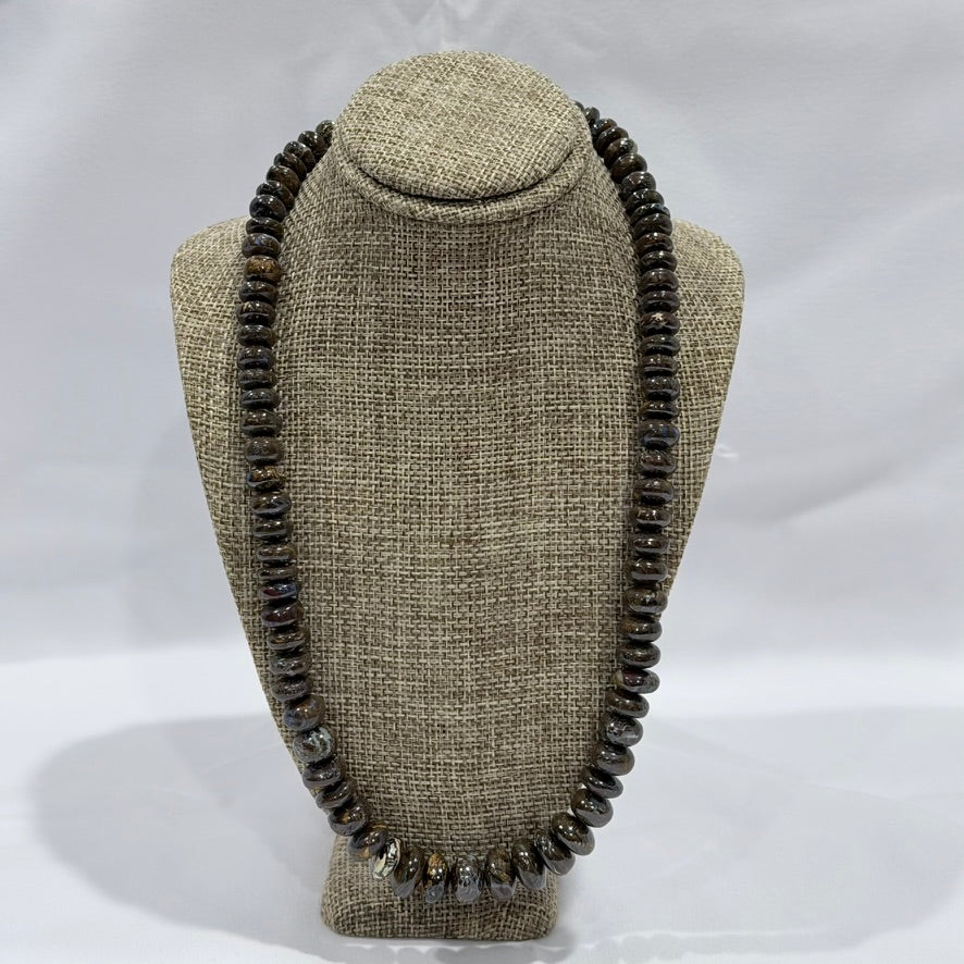 A bold and earthy statement piece featuring richly polished dark stone beads with natural marbling and subtle metallic undertones. Each bead is uniquely patterned, giving the strand a one-of-a-kind character and depth. Smooth, glossy, and weighty in feel, this piece brings a grounded, sophisticated edge to any look — perfect for both everyday wear and standout styling.